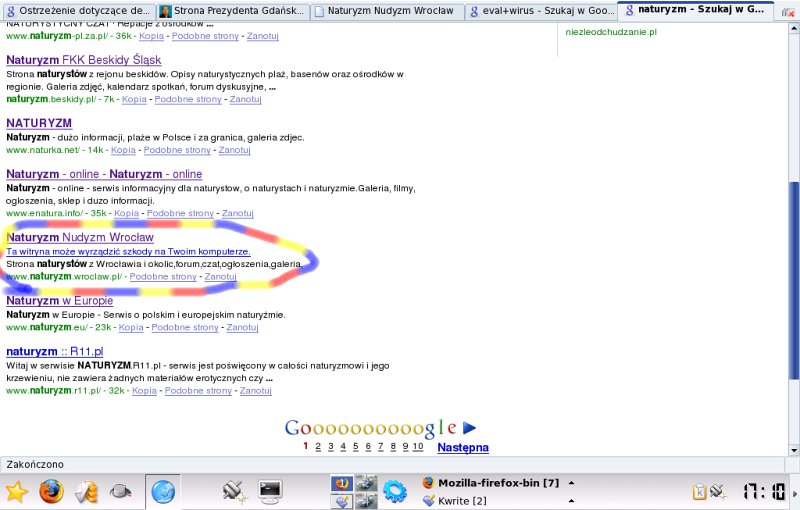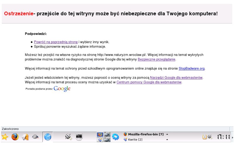 Około dwa tygodnie temu doznałem niezłego stresu gdy dostałem maila od firmy Google, w którym zostałem poinformowani, że witryna Naturyzm Wrocław którą zarządzam została uznana za niebezpieczną dla użytkowników i częściowo zablokowana w wyszukiwarce. Blokada polegała na wyświetlaniu w wynikach wyszukiwania przy linku do witryny ostrzeżenia: "Ta witryna może wyrządzić szkody na Twoim komputerze" (ang: This site may harm your computer).